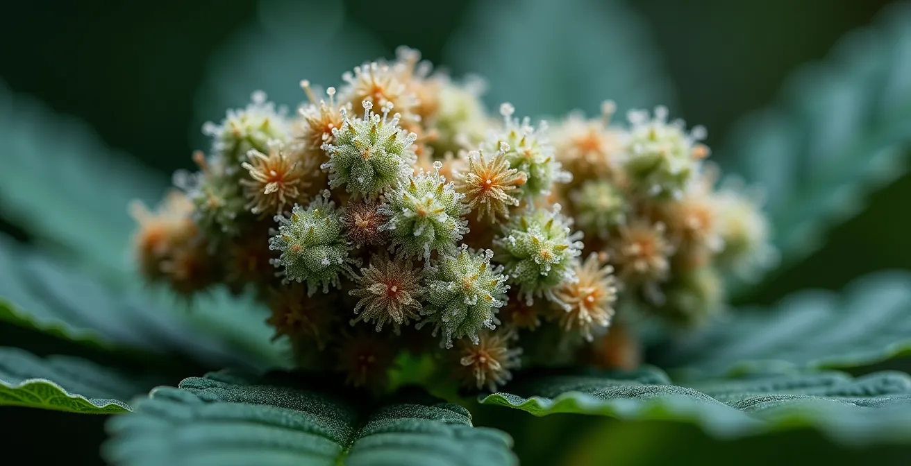 Après avoir déconstruit les mythes, revenons à l’observation pure. Le véritable indicateur visuel de la qualité et du moment de la récolte ne se voit pas à l’œil nu, mais avec une simple loupe de bijoutier (x30 ou x60) : les trichomes. Ces petites glandes résineuses qui recouvrent la fleur comme une couche de givre sont les usines à cannabinoïdes et à terpènes de la plante. Leur couleur révèle avec une précision chirurgicale le stade de maturité de la fleur, et donc son profil d’effets potentiel.